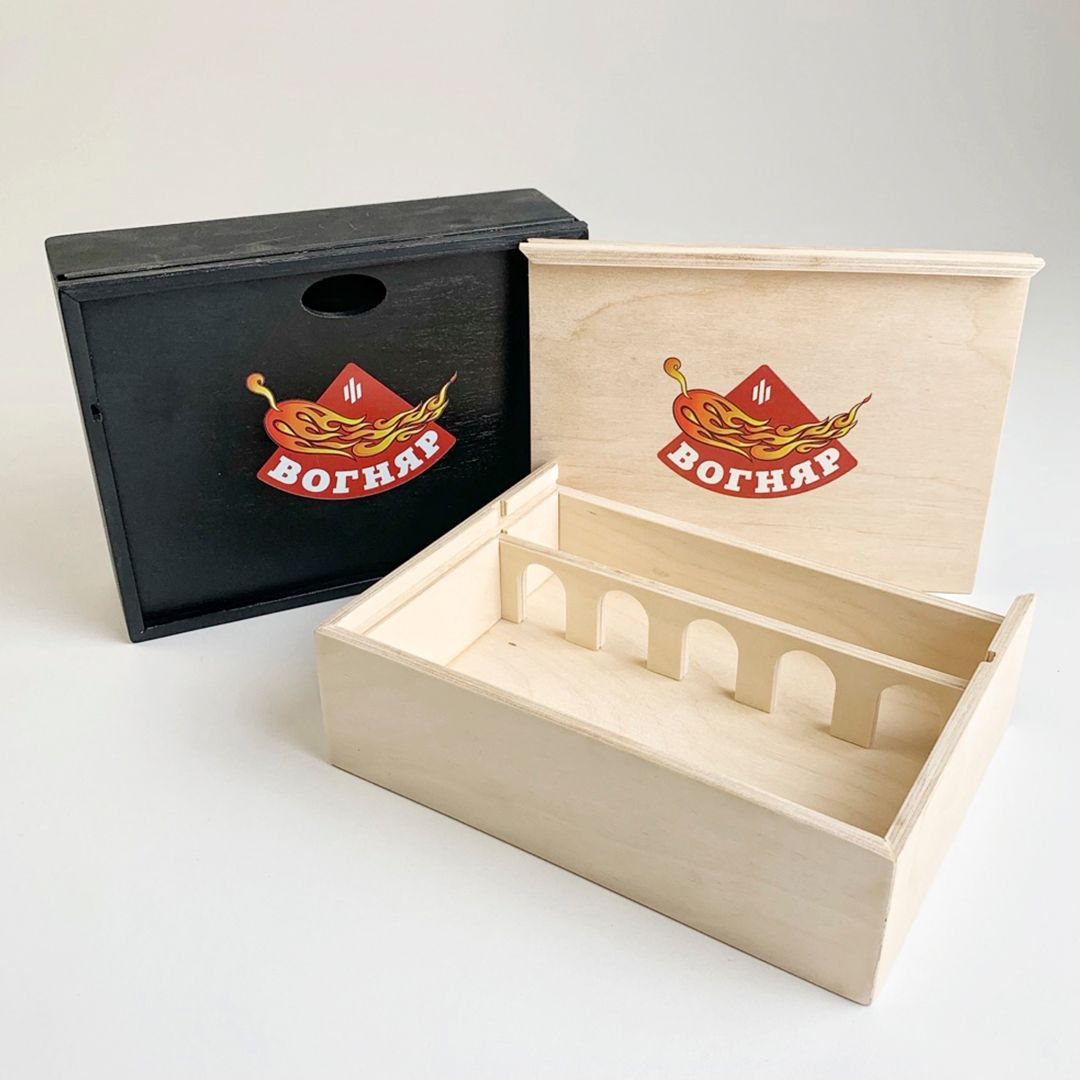 з фанери та дерева. Вишукані, надійні коробки максимально міцні та екологічні. Нададуть будь-якому товару лоску і дорожнечі. Підходять для пакування подарунків, алкоголю, сувенірів, ювелірних прикрас, посуду та інших товарів. Чудово виглядають у поєднанні з лазерним гравіюванням і шовкотрафаретним/уф друком.